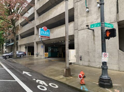 Entrance and exit located on SW 3rd between SW Columbia & Clay. Entrance and exits have a level driveway ramp from the street level into the garage/building. Prominent Red & Green sign w/ Neon that reads ‘Park Available’ can be found at the entrance/exit as well as Parking NW logos posted at the signage inside. Clearance bar hanging immediately in the entry/exit driveway as well as stenciled arrows lining the driveway lanes instruct which side is the entrance and exit.