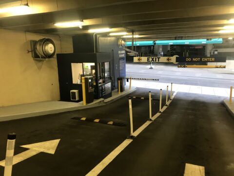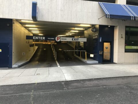 This facility has entrances and exits that are located on SW Jefferson between SW 1st & 2nd Ave across the street from The Portland Astoria Apartments and Koin Tower, between Auditorium Cleaners and CityKids Daycare. The first entrance on SW Market is located between SW 1st & 2nd Ave across the street from 1st & Jefferson SmartPark entrance. Each entrance and exit has a driveway ramp from the street into where the garage/building begins. Prominent Blue, White and Red ‘Columbia Square’ sign can be found at the entrance/exit as well as Parking NW logos posted at the signage inside. Clearance bar hanging immediately in the entry/exit driveway instructs which side is the entrance and and exit. The entrance is the first driveway as you drive up Jefferson St (one-way) and the second driveway, where there is an attendant booth alongside, is the exit lane.