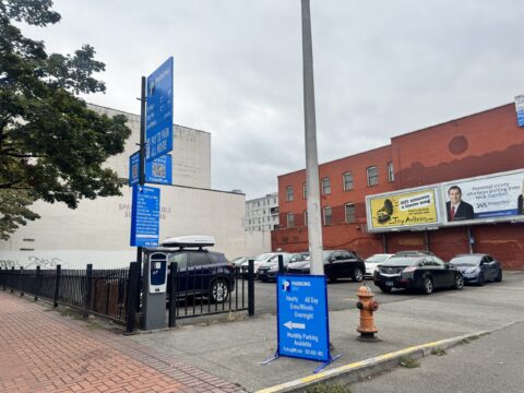 Surface parking located on NW Glisan St. with the entrance and exit on the corner of 5th and Glisan